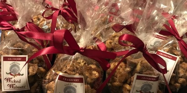 Cape Cod Wicked Walnuts are a delicious blend of baked walnuts, sweetened dried cranberries and spices in a Cape Cod themed Gourmet Gift Bag. Delicious as a Snack out of the bag, Hostess Gift or Wedding or Corporate Favor.